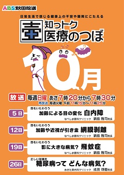 秋田放送で毎週日曜の朝7:20から放映しています、知っトク「医療のつぼ」の10月の放送予定を掲載します。