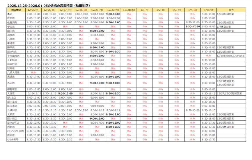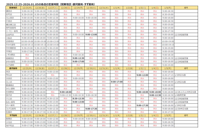 2025年~2026年の年末年始にかけての各店の営業時間をお知らせします。