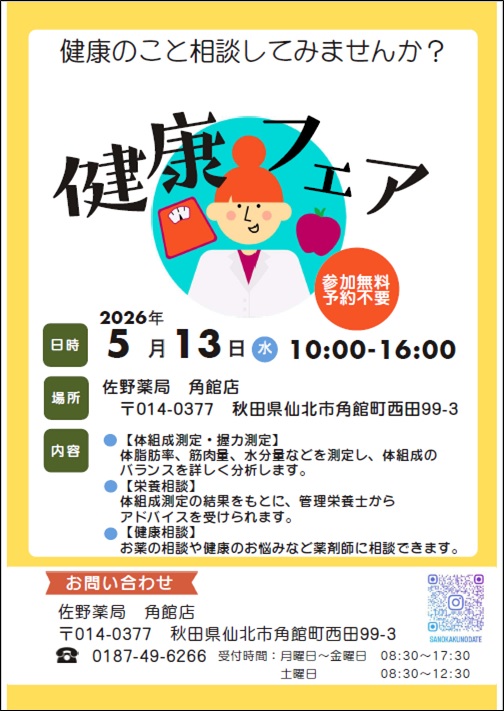 5/13(水)に10:00-16:00の時間で、秋田県仙北市の「佐野薬局角館店」にて「健康フェア」を開催します。