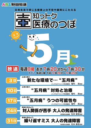 秋田放送で毎週日曜の朝7:20から放映しています、知っトク「医療のつぼ」の5月の放送予定を掲載します。